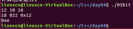 /* 进制练习 */ #include <stdio.h> int main() { printf("%d %d %d\n", 12, 012, 0x12); printf("%d 0%o 0x%x\n", 18, 18, 18); printf("%p\n", 14); return 0; }
