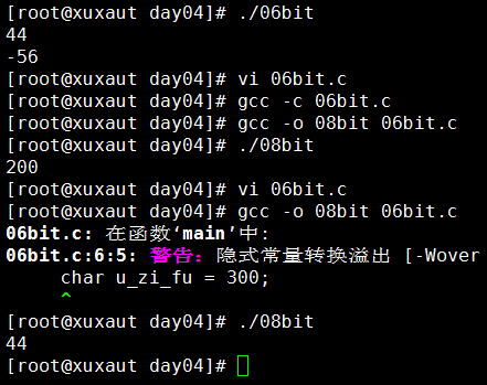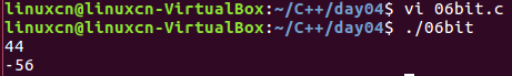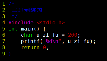 /* 二进制练习 */ #include <stdio.h> int main() { int shu_zi = 300; unsigned char u_zi_fu = 200; char zi_fu = shu_zi; printf("%d\n", zi_fu); 44 zi_fu = u_zi_fu; printf("%d\n", zi_fu); -56 return 0; }