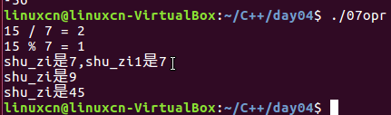 /* 操作符练习 */ #include <stdio.h> int main() { int shu_zi = 0, shu_zi1 = 0; printf("15 / 7 = %d\n", 15 / 7); printf("15 %% 7 = %d\n", 15 % 7); shu_zi = shu_zi1 = 7; printf("shu_zi是%d,shu_zi1是%d\n", shu_zi, shu_zi1); shu_zi += 2; //相当于shu_zi = shu_zi + 2 printf("shu_zi是%d\n", shu_zi); shu_zi *= 2 + 3; printf("shu_zi是%d\n", shu_zi); return 0; }