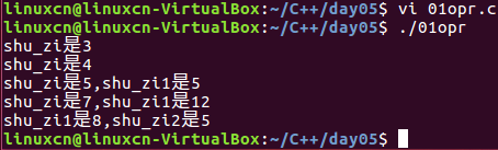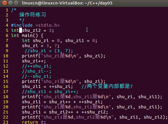 /* 操作符练习 */ #include <stdio.h> int shu_zi2 = 3; int main() { int shu_zi = 0, shu_zi1 = 0; //shu_zi = 3, 7; shu_zi = (3, 7); printf("shu_zi是%d\n", shu_zi); //shu_zi++; //++shu_zi; //shu_zi--; --shu_zi; printf("shu_zi是%d\n", shu_zi); //shu_zi1 = ++shu_zi; //两个变量内部都是7 shu_zi1 = shu_zi++; printf("shu_zi是%d,shu_zi1是%d\n", shu_zi, shu_zi1); 7 ,6 操作符写在变量前优先级非常高,写在后面优先级低 shu_zi1 = shu_zi++ + ++shu_zi; printf("shu_zi是%d,shu_zi1是%d\n", shu_zi, shu_zi1); 9 ,16 通过++shu_zi=8, shu_zi1 = 8+8=16; 然后,shu_zi++变为9 shu_zi1 = shu_zi2++ + ++shu_zi2;16 printf("shu_zi1是%d,shu_zi2是%d\n", shu_zi1, shu_zi2); 8 , 5 通过++shu_zi2=4, shu_zi1 = 4+4=8; 然后,shu_zi2++变为5 return 0; }7
