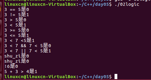 /* 逻辑操作符练习 */ #include <stdio.h> int main() { int shu_zi = 0; printf("3 == 5是%d\n", 3 == 5); printf("3 != 5是%d\n", 3 != 5); printf("3 > 5是%d\n", 3 > 5); printf("3 < 5是%d\n", 3 < 5); printf("3 >= 5是%d\n", 3 >= 5); printf("3 <= 5是%d\n", 3 <= 5); printf("3 < 7 < 5是%d\n", 3 < 7 < 5); // 1,具有短路特性 printf("3 < 7 && 7 < 5是%d\n", 3 < 7 && 7 < 5); printf("3 < 7 || 7 < 5是%d\n", 3 < 7 || 7 < 5); 3 > 5 && ++shu_zi; printf("shu_zi是%d\n", shu_zi); //0, &&具有短路特性, ++shu_zi不执行 3 < 5 || ++shu_zi; printf("shu_zi是%d\n", shu_zi); //0, ||具有短路特性,++shu_zi不执行 printf("!6是%d\n", !6); // 0 printf("5 + 3 > 4是%d\n", 5 + 3 > 4); //进行逻辑运算判断时,0为假,非0值为真,习惯上用1来表示真,其它非零值也可以! return 0; }