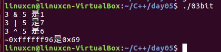 /* 位操作符 */ #include <stdio.h> int main() { printf("3 & 5是%d\n", 3 & 5); printf("3 | 5是%d\n", 3 | 5); printf("3 ^ 5是%d\n", 3 ^ 5); printf("~0xffffff96是0x%x\n", ~0xffffff96); return 0; }