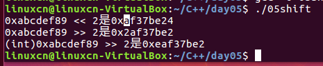 /* 移位操作 */ #include <stdio.h> int main() { printf("0xabcdef89 << 2是0x%x\n", 0xabcdef89 << 2); printf("0xabcdef89 >> 2是0x%x\n", 0xabcdef89 >> 2); printf("(int)0xabcdef89 >> 2是0x%x\n", (int)0xabcdef89 >> 2); return 0; }