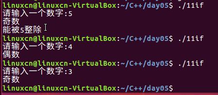/* if练习 */ #include <stdio.h> int main() { int shu_zi = 0; printf("请输入一个数字:"); scanf("%d", &shu_zi); if (shu_zi % 2) { printf("奇数\n"); if (!(shu_zi % 5)) { printf("能被5整除\n"); } } else { printf("偶数\n"); } /*if (!(shu_zi % 5) && (shu_zi % 2)) { printf("能被5整除\n"); }*/ return 0; }