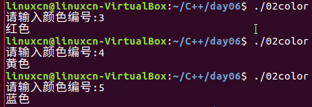 /* switch...case练习 */ #include <stdio.h> int main() { int yan_se = 0; printf("请输入颜色编号:"); scanf("%d", &yan_se); /*if (0 == yan_se) { printf("红色\n"); } else if (1 == yan_se) { printf("黄色\n"); } else if (2 == yan_se) { printf("蓝色\n"); }*/ switch (yan_se % 3) { case 0: printf("红色\n"); break; case 1: printf("黄色\n"); break; case 2: printf("蓝色\n"); break; default: printf("你有病吧\n"); break; } return 0; }