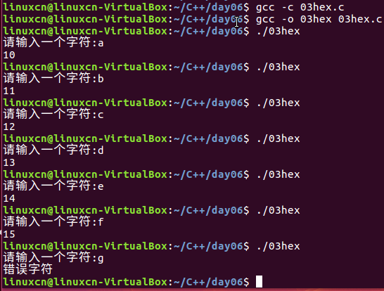 /* switch...case练习 */ #include <stdio.h> int main() { char zi_fu = 0; printf("请输入一个字符:"); scanf("%c", &zi_fu); switch (zi_fu) { case 'a': printf("10\n"); break; case 'b': printf("11\n"); break; case 'c': printf("12\n"); break; case 'd': printf("13\n"); break; case 'e': printf("14\n"); break; case 'f': printf("15\n"); break; default: printf("错误字符\n"); break; } return 0; }