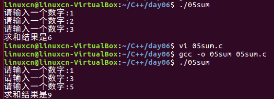 /* 求和练习 */ #include <stdio.h> int main() { int xun_huan = 0, shu_zi = 0, he = 0; for (xun_huan = 0;xun_huan < 3;xun_huan++) { printf("请输入一个数字:"); scanf("%d", &shu_zi); he += shu_zi; } printf("求和结果是%d\n", he); return 0; }