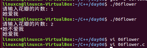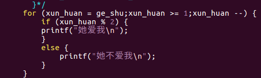 /* 循环练习 */ #include <stdio.h> int main() { int ge_shu = 0, xun_huan = 0, biao_zhi = 0; printf("请输入花瓣的片数:"); scanf("%d", &ge_shu); /*for (xun_huan = 0;xun_huan < ge_shu;xun_huan++) { if (biao_zhi) { printf("她爱我\n"); } else { printf("她不爱我\n"); } biao_zhi = 1 - biao_zhi; }*/ for (xun_huan = ge_shu;xun_huan >= 1;xun_huan--) { if (xun_huan % 2) { printf("她爱我\n"); } else { printf("她不爱我\n"); } } return 0; }