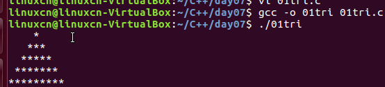 1 /* 2 循环嵌套练习 3 */ 4 #include <stdio.h> 5 int main() { 6 int xun_huan = 0, xun_huan1 = 4; 7 for (xun_huan1 = 0;xun_huan1 <= 4;xun_huan1++) { 8 for (xun_huan = 0;xun_huan <= (3 - xun_huan1);xun_huan++) { 9 printf(" "); 10 } 11 for (xun_huan = (4 - xun_huan1);xun_huan <= (4 + xun_huan1);xun_huan++) { 12 printf("*"); 13 } 14 printf("\n"); 15 } 16 return 0; 17 }