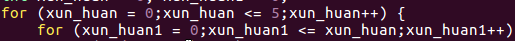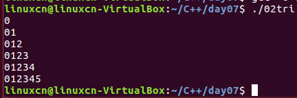 /* 循环嵌套练习 */ #include <stdio.h> int main() { int xun_huan = 0, xun_huan1 = 0; for (xun_huan = 0;xun_huan <= 5;xun_huan++) { for (xun_huan1 = 0;xun_huan1 <= xun_huan;xun_huan1++) { printf("%d", xun_huan1); } printf("\n"); } return 0; }