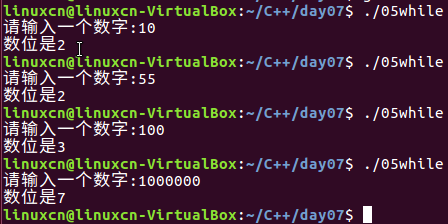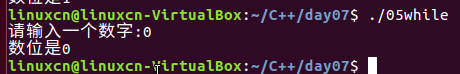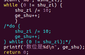 1 /* 2 while练习 3 */ 4 #include <stdio.h> 5 int main() { 6 int shu_zi = 0, ge_shu = 0; 7 printf("请输入一个数字:"); 8 scanf("%d", &shu_zi); 9 /*while (0 != shu_zi) { 10 shu_zi /= 10; 11 ge_shu++; 12 }*/ 13 do { 14 shu_zi /= 10; 15 ge_shu++; 16 } while (0 != shu_zi); 17 printf("数位是%d\n", ge_shu); 18 return 0; 19 }