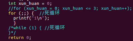 1 /* 2 循环练习 3 */ 4 #include <stdio.h> 5 int main() { 6 int xun_huan = 0; 7 //for (xun_huan = 0; xun_huan <= 3; xun_huan++); 8 /*for (;;) { //死循环 9 printf("1\n"); 10 }*/ 11 while (1) { //死循环 12 } 13 return 0; 14 }