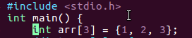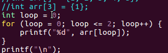 1 /* 2 数组初始化练习 3 */ 4 #include <stdio.h> 5 int main() { 6 //int arr[3] = {1, 2, 3}; 7 //int arr[3] = {1, 2, 3, 4, 5}; 8 //int arr[] = {1, 2, 3, 4, 5}; 9 int arr[3] = {1}; 10 int loop = 0; 11 for (loop = 0; loop <= 2; loop++) { 12 printf("%d ", arr[loop]); 13 } 14 printf("\n"); 15 return 0; 16 }