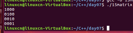 1 /* 2 二维数组练习 3 */ 4 #include <stdio.h> 5 int main() { 6 /*int arr[][4] = {{1}, 7 {0, 1}, 8 {0, 0, 1}, 9 {0, 0, 0, 1}};*/ 10 int arr[4][4] = {0}; 11 arr[0][0] = 1; 12 arr[1][1] = 1; 13 arr[2][2] = 1; 14 arr[3][3] = 1; 15 int row = 0, col = 0; 16 for (row = 0; row <= 3; row++) { 17 for (col = 0; col <= 3; col++) { 18 printf("%d ", arr[row][col]); 19 } 20 printf("\n"); 21 } 22 return 0; 23 }
