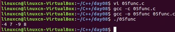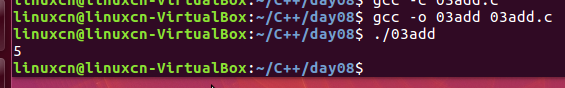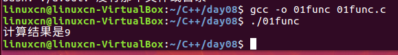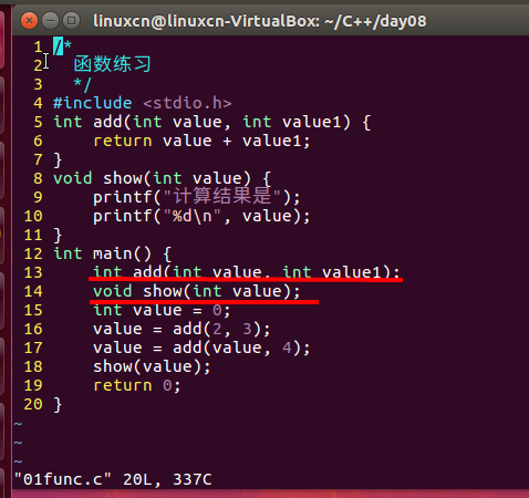1 /* 2 函数练习 3 */ 4 #include <stdio.h> 5 //int add(); 隐式函数声明 6 int add(int , int ); //显示函数声明 7 int main() { 8 int value = 0; 9 value = add(2, 3); 10 printf("%d\n", value); 11 return 0; 12 } 13 int add(int value, int value1) { 14 return value + value1; 15 }