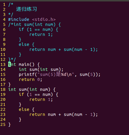 /* 递归练习 */ #include <stdio.h> int sum(int num) { if (1 == num) { return 1; } else { return num + sum(num - 1); } } int main() { printf("sum(5)是%d\n", sum(5)); return 0; }