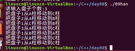 /* 递归练习 */ #include <stdio.h> void han(int num, char src, char mid, char dest) { if (1 == num) { printf("把盘子%d从%c柱移动到%c柱\n", num, src, dest); } else { han(num - 1, src, dest, mid); printf("把盘子%d从%c柱移动到%c柱\n", num, src, dest); han(num - 1, mid, src, dest); } } int main() { int num = 0; printf("请输入盘子个数:"); scanf("%d", &num); han(num, 'A', 'B', 'C'); return 0; }
