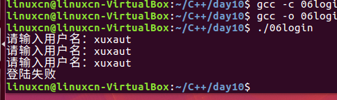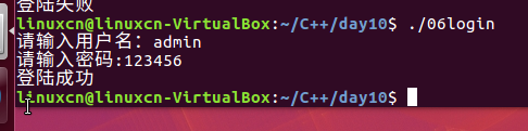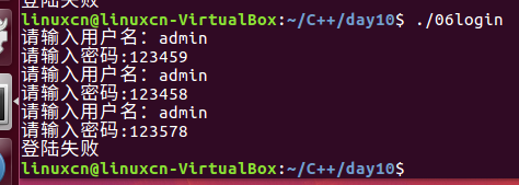 /*模拟登陆练习*/#include<stdio.h>#include<string.h>int main(){int loop =0;char buf[10];for(loop =0; loop <3; loop++){printf("请输入用户名:");fgets(buf,10, stdin);if(strcmp(buf,"admin\n")){continue;}printf("请输入密码:");fgets(buf,10, stdin);if(!strcmp(buf,"123456\n")){break;}}if(loop <3){printf("登陆成功\n");}else{printf("登陆失败\n");}return0;}