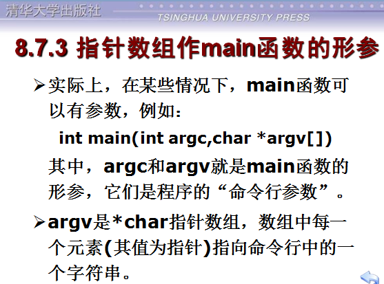 /*main函数的参数*/#include<stdio.h>int main(int argc,char*argv[]){int loop =0;for(loop =0; loop <= argc -1; loop++){printf("%s\n", argv[loop]);}return0;}