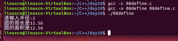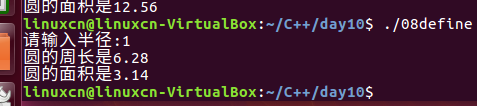 /*宏练习*/#include<stdio.h>#define PI 3.14f#define CIRCLE(r)2* PI * r#define AREA(r) PI * r * rint main(){int radius =0;printf("请输入半径:");scanf("%d",&radius);printf("圆的周长是%g\n", CIRCLE(radius));printf("圆的面积是%g\n", AREA(radius));return0;}