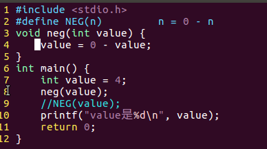 /*宏练习*/#include<stdio.h>#define NEG(n) n =0- nvoid neg(int value){value =0- value;}int main(){int value =4;//neg(value);NEG(value);printf("value是%d\n", value);return0;}