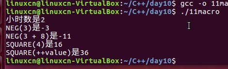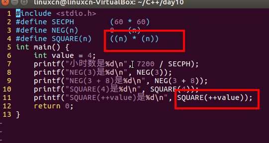 /*宏练习*/#include<stdio.h>#define SECPH (60*60)#define NEG(n)0-(n)#define SQUARE(n)((n)*(n))int main(){int value =4;printf("小时数是%d\n",7200/ SECPH);printf("NEG(3)是%d\n", NEG(3));printf("NEG(3 + 8)是%d\n", NEG(3+8));printf("SQUARE(4)是%d\n", SQUARE(4));printf("SQUARE(++value)是%d\n", SQUARE(++value));return0;}