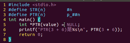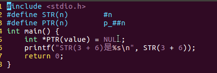 /*宏练习*/#include<stdio.h>#define STR(n)#n#define PTR(n) p_##nint main(){int*PTR(value)= NULL;printf("STR(3 + 6)是%s\n", STR(3+6));return0;}