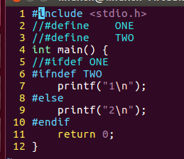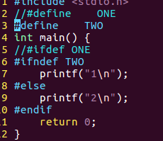 /*条件编译练习*/#include<stdio.h>//#define ONE//#define TWOint main(){//#ifdef ONE#ifndef TWOprintf("1\n");#elseprintf("2\n");#endifreturn0;}