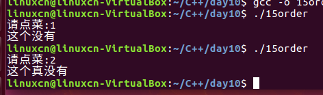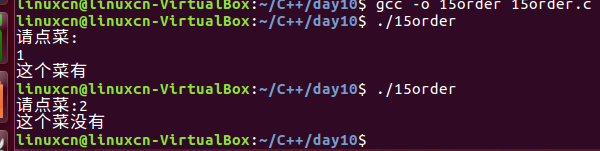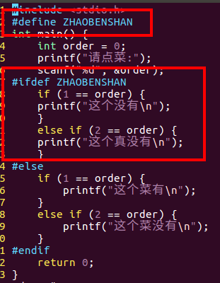 /*点菜练习*/#include<stdio.h>int main(){int order =0;printf("请点菜:");scanf("%d",&order);//#ifdef ZHAOBENSHAN#if defined(ZHAOBENSHAN)if(1== order){printf("这个没有\n");}elseif(2== order){printf("这个真没有\n");}#elseif(1== order){printf("这个菜有\n");}elseif(2== order){printf("这个菜没有\n");}#endifreturn0;}