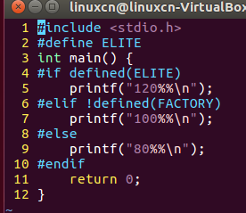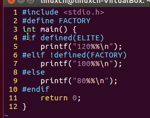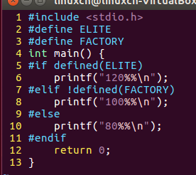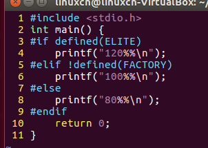 /*条件编译练习*/#include<stdio.h>int main(){#if defined(ELITE)printf("120%%\n");#elif!defined(FACTORY)printf("100%%\n");#elseprintf("80%%\n");#endifreturn0;}