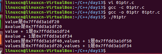 /*数组指针练习*/#include<stdio.h>int main(){int value[5]={0};int values[3][4]={0};int*p_value = value;int(*p_value1)[5]=&value;printf("value是%p\n", value);printf("&value是%p\n",&value);printf("value + 1是%p\n", value +1);printf("&value + 1是%p\n",&value +1);aprintf("values是%p,values + 1是%p\n", values, values +1);printf("p_value1是%p,p_value1 + 1是%p\n", p_value1, p_value1 +1);return0;}