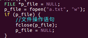 /*文件练习*/#include<stdio.h>int main(){FILE*p_file = NULL;p_file = fopen("a.txt","w");if(p_file){//文件操作语句fclose(p_file);p_file = NULL;}return0;}