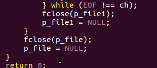 /*文件练习*/#include<stdio.h>int main(){FILE*p_file = NULL,*p_file1 = NULL;p_file = fopen("a.txt","r");if(p_file){p_file1 = fopen("b.txt","w");if(p_file1){char ch =0;do{ch = fgetc(p_file);if(EOF != ch){if(EOF == fputc(ch, p_file1)){break;}}}while(EOF != ch);fclose(p_file1);p_file1 = NULL;}fclose(p_file);p_file = NULL;}return0;}