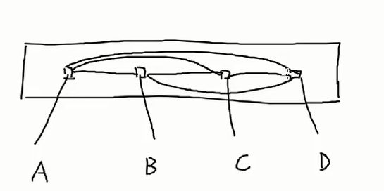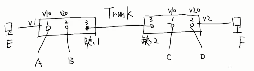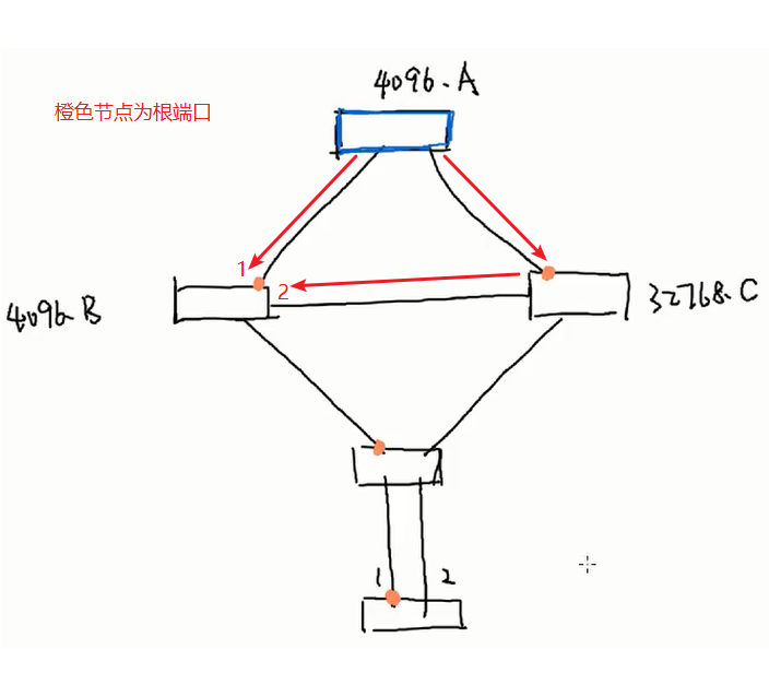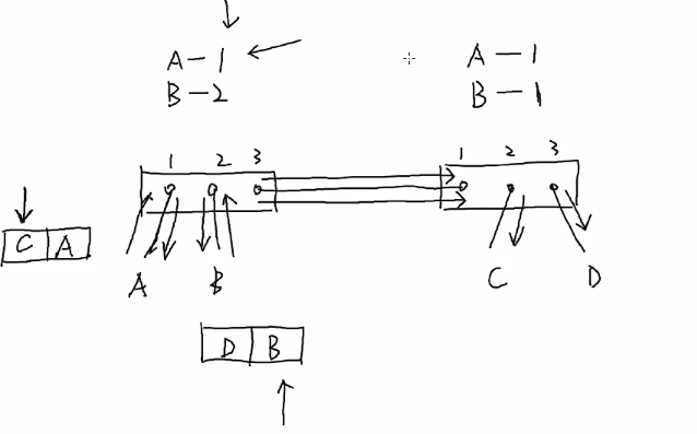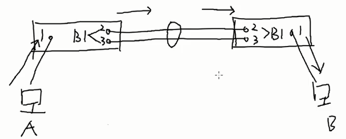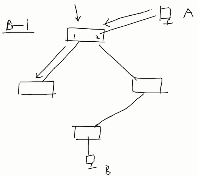 A进行广播,交换机广播的时候是向B1口进行广播,然后B1内部分配,当广播到右边交换机,右边交换机只能感知到是右边交换机B1发出的