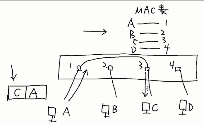 ③图中bit流传输到交换机,交换机检查数据帧目的MAC地址,根据MAC地址表,查询到C对应的是2口,将数据帧从1转交给2