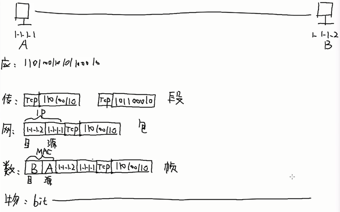图中箭头表示数据在物,数,网三层的解/封情况以及数据传输到的对应位置