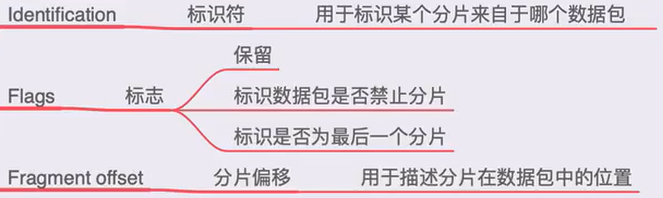 ③flags:三个标志位,第一个标志位:暂时没有实际意义,仅保留;第二个标志位:若0代表禁止分片功能未开启;第三个标志位:若0代表不是最后一个分片