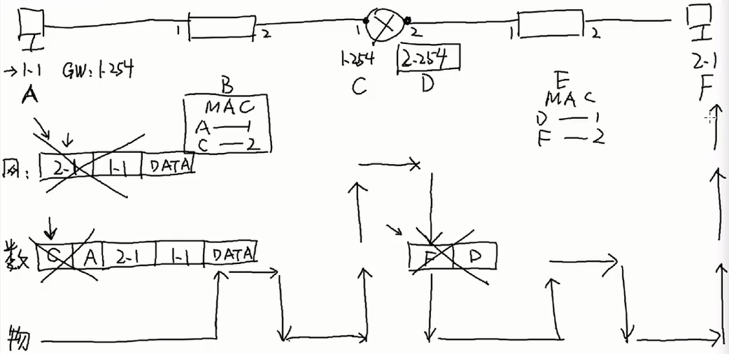 ④图中路由器收到bit流,解封装发现目的MAC对应自己,继续解封装,路由器解析目的IP,发现处于2.1处于2.0网段,会将数据包从1转交给2(2口是2.0网段的网关),路由器发送ARP请求封装,获取2.1的MAC地址进行封装