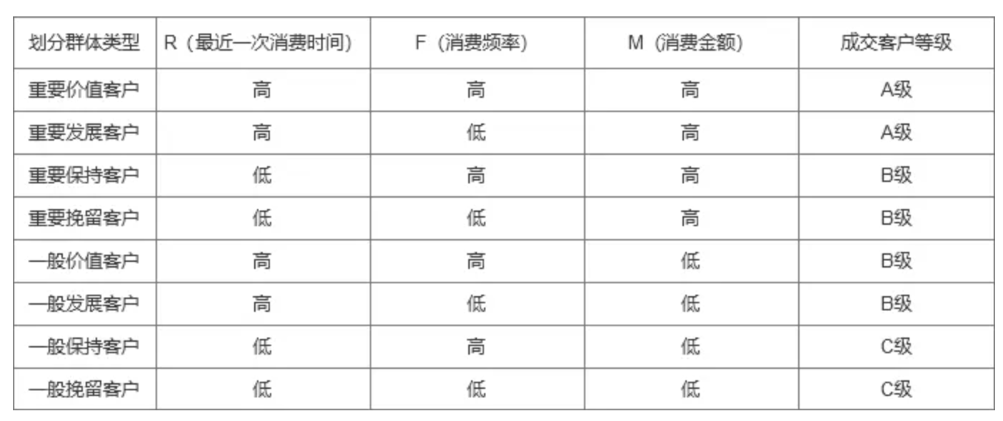 这三个关键指标判断客户价值并对客户进行观察和分类,针对不同的特征的客户进行相应的营销策略,如下图所示: