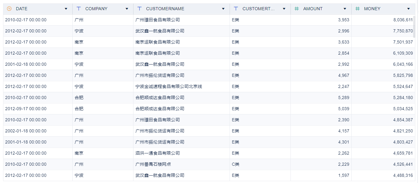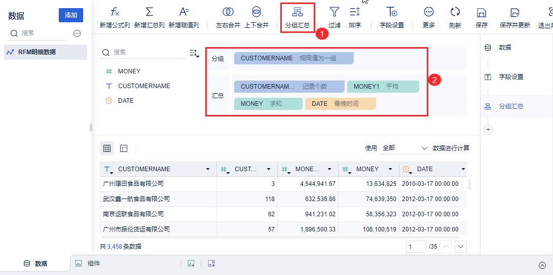 ④ 「MONEY」的汇总方式选择「求和」,可求到每个用户消费金额。