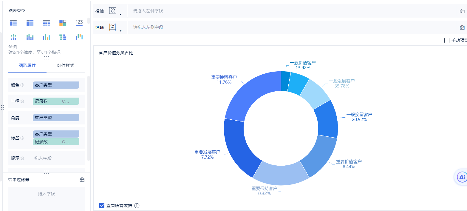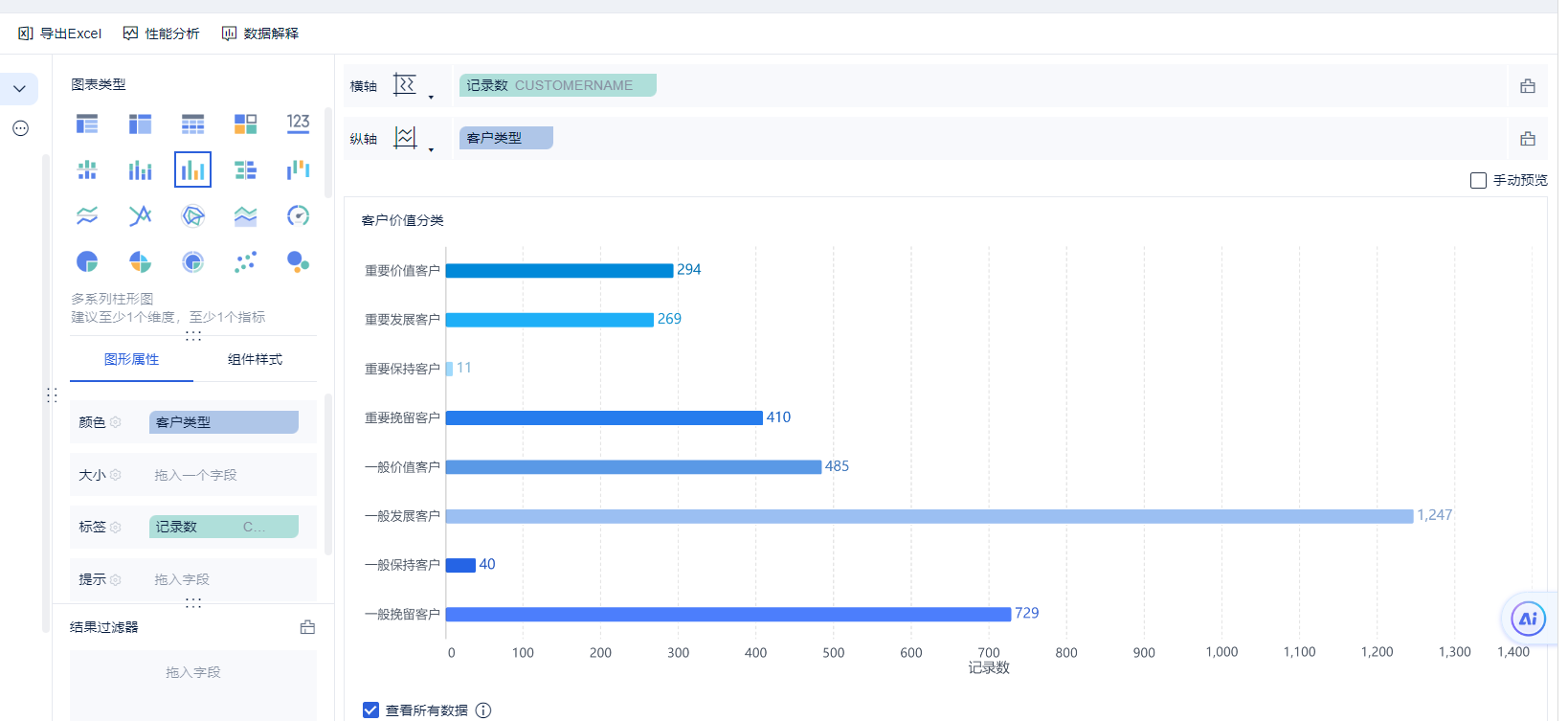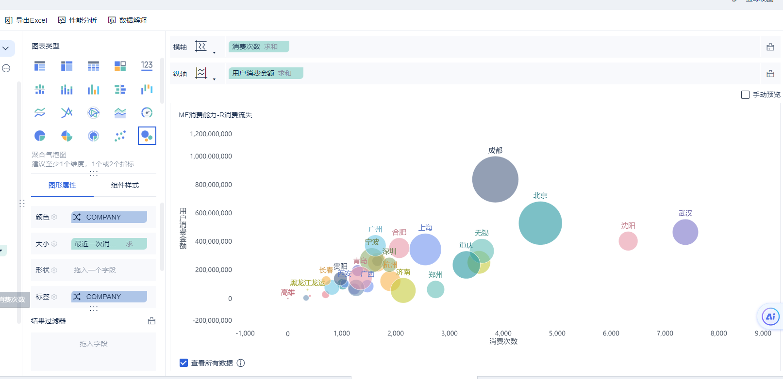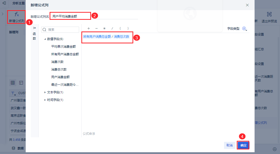 ② 消费次数(F):由于有一条记录代表该用户购买了一次,所以随意拖入一个「CUSTOMERNAME」求「记录个数」即可;