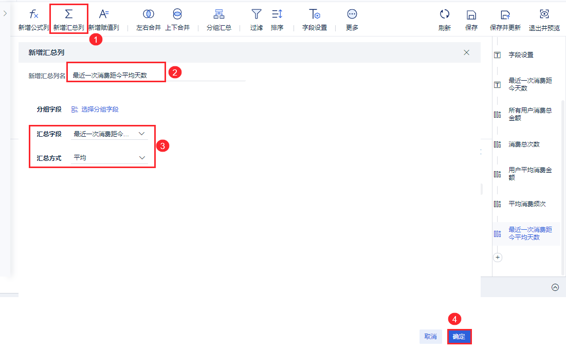 ③ 平均单次消费金额(M):「MONEY1」的汇总方式选择「平均」,可求到每个用户平均单次消费金额;