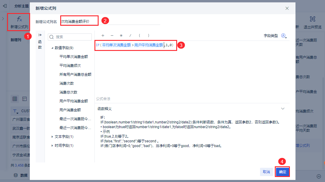 新增公式列「次均消费金额评价」,当用户平均单次消费金额大于用户总体平均值时,标记为 1 ,否则标记为 0 ,公式为IF(平均单次消费金额>用户平均消费金额,1,0)
