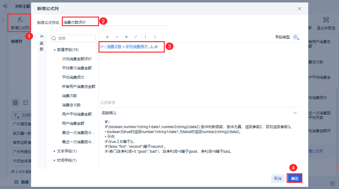 新增公式列「消费次数评价」,当用户消费次数大于用户总体平均值时,标记为 1 ,否则标记为 0 ,公式为IF(消费次数>平均消费频次,1,0)