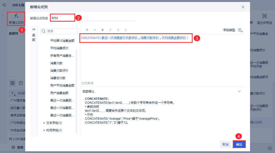 新增公式列「RFM」,使用 CONCATENATE() 函数将 RFM 向量化值拼接起来,顺序为:最近一次消费距今天数评价、消费次数评价、次均消费金额评价。公式为CONCATENATE(最近一次消费距今天数评价,消费次数评价,次均消费金额评价)