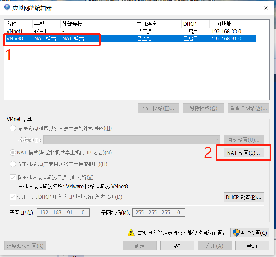 首先检查虚拟机所在的局域网网段、网关,点击VMware左上角“编辑”——“虚拟网络编辑器”——选择“VMnet8”——点击“NAT设置(s)"