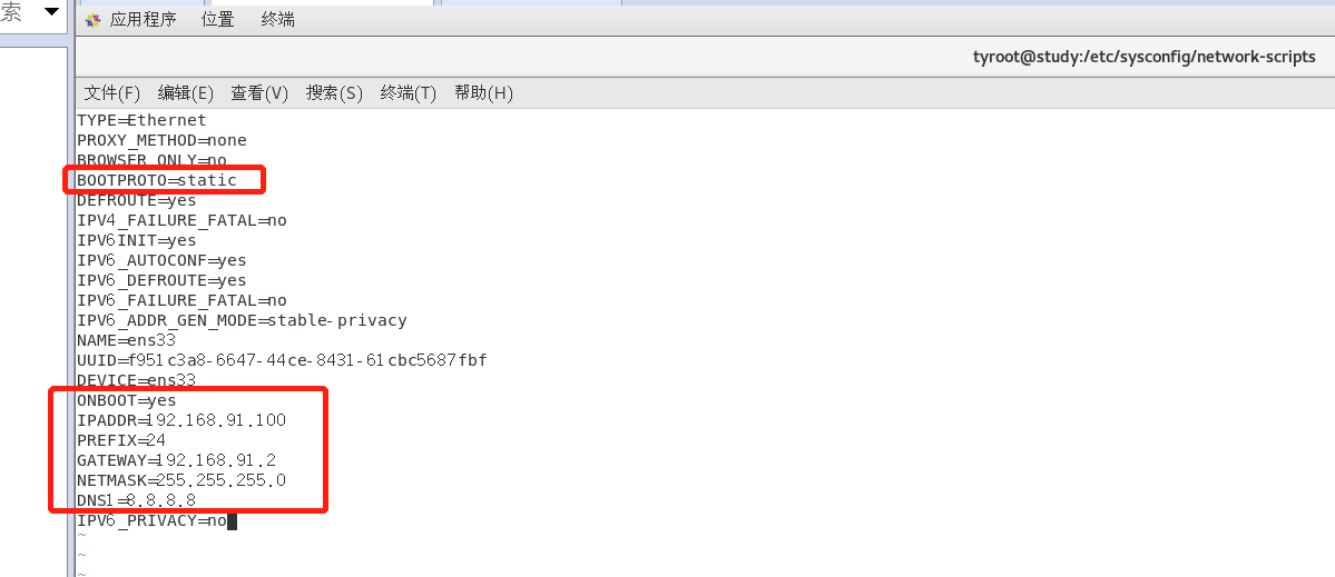 vi ifcfg-ensxxx 进入对应的ensXXX 配置网络参数,修改"BOOTPROTO"参数为"static",并将"ONBOOT"由"no"修改为"yes" (开机自启动)