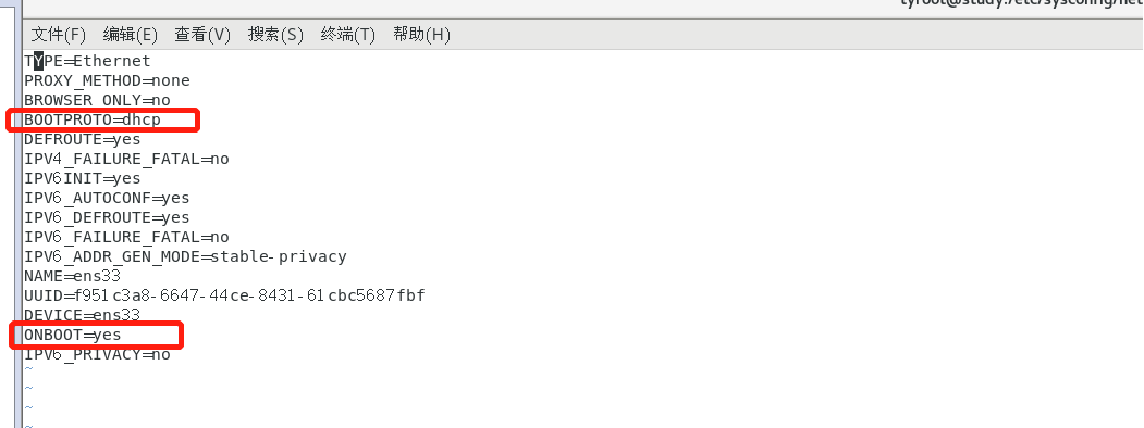 如果任使用配置网络参数,与方式一不同之处在于最后,网络ensXXX的配置不用指定IP,模式修改为dhcp