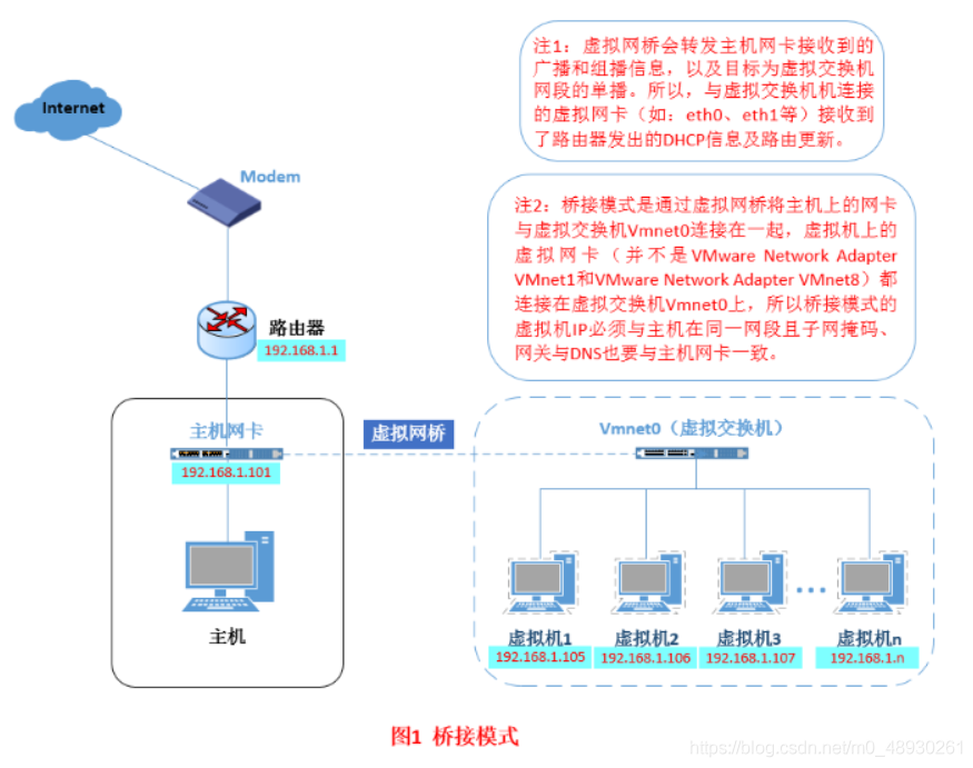 桥接模式是将虚拟机的虚拟网络适配器与主机的物理网络适配器进行交接,虚拟网卡和主机物理网卡通过VMnet0虚拟交换机进行桥接。虚拟交换机相当于一台现实网络中的交换机,虚拟机中的虚拟网络适配器可通过主机中的物理网络适配器直接访问到外部网络,物理网卡和虚拟网卡处于同一网段。就好像局域网中添加了一台新的、独立的计算机一样。因此,虚拟机也会占用局域网中的一个IP地址,并且可以和其他终端进行相互访问。