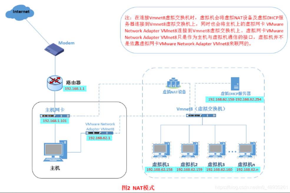 如果你想创建一个虚拟机只给自己使用,不需要给局域网其他人用,就可以选择NAT模式。NAT模式下的虚拟系统的TCP/IP配置信息是由VMnet8(NAT)虚拟网络的DHCP服务提供的,只要虚拟机的网络配置是DHCP,那么不需要进行其他任何配置,只要宿主机器能访问互联网,虚拟机就可以。在一台主机上只允许有一个NAT模式的虚拟网络,因此,同一台主机上采用NAT模式网络连接的多个虚拟机之间也可以互相访问。如果你想创建多个虚拟机集群,作为自己测试使用,也可以使用NAT模式。